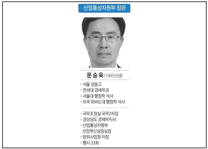 문승욱 장관은 행정고시 33회로 공직에 입문해 중견기업정책관, 산업부 시스템산업정책관, 산업혁신성장실장 등 줄곧 산업정책 분야에 근무한 산업정책통입니다.