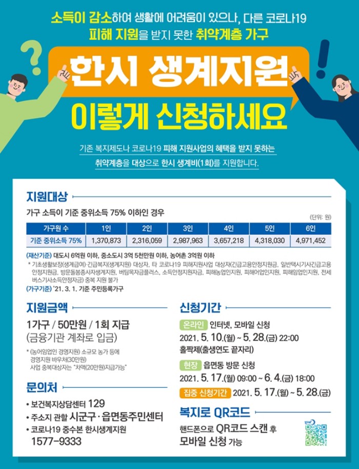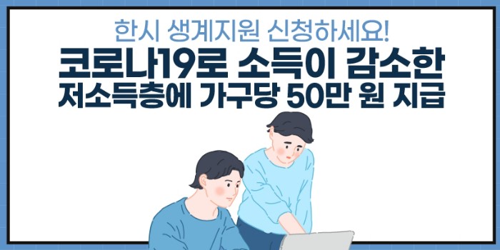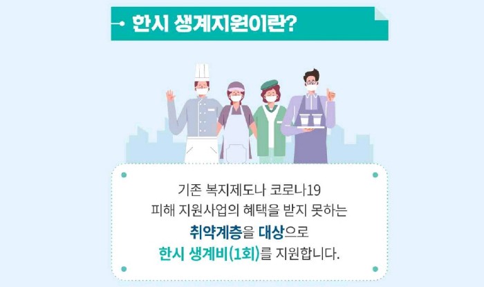 한시 생계지원 대상은 ① 소득 감소로 인해 생계가 어려우나 (실직 및 휴업, 폐업 등) ② 기초생활 생계급여, 4차 재난지원금 등 복지제도 및 코로나 피해 지원을 받지 못한 저소득층에게 가구당 50만원을 지원합니다.