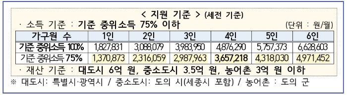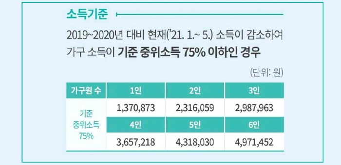 소득 기준은 가구원 중 한 명이라도 2021년 1월~5월 근로소득, 사업소득이 2019년 또는 2020년에 비해 감소했고 가구소득이 기준중위소득 75% 이하인 가구입니다.