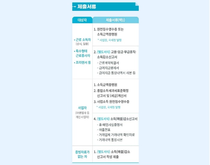 원천징수영수증, 소득금액증명원, 건강보험자격득실확인서, 신용카드 매출확인서, 휴폐업신고서, 매출입전표, 거래업체간의 거래내역 확인서류(거래명세서, 통장거래내역서), 급여내역 등이 확인되는 통장사본, 증빙자료 없는 경우 (본인작성) 소득(매출)감소신고서