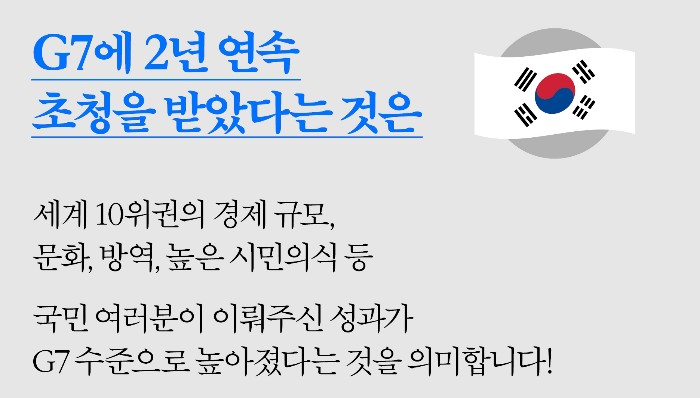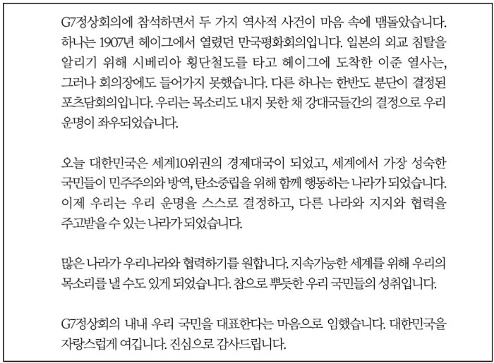 많은 나라가 우리나라와 협력하기를 원합니다. 지속가능한 세계를 위해 우리의 목소리를 낼 수도 있게 되었습니다. 참으로 뿌듯한 우리 국민들의 성취입니다. G7 정상회의 내내 우리 국민을 대표한다는 마음으로 임했습니다. 대한민국을 자랑스럽게 여깁니다. 진심으로 감사드립니다.