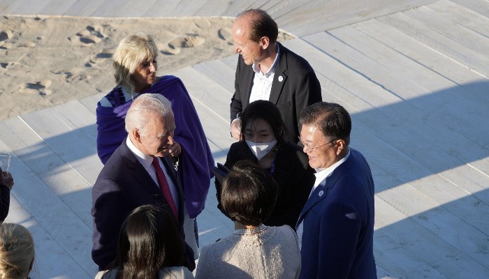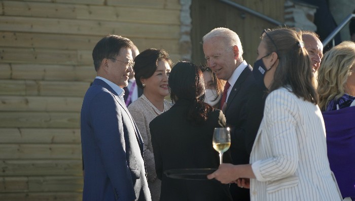 5월말 한미 정상회담 이후 문재인 대통령은 6월 12일 오후 G7 정상회의가 열리고 있는 영국 콘월 카비스 베이 호텔 회담장에서 바이든 미국 대통령과 만나 인사를 나눴습니다.