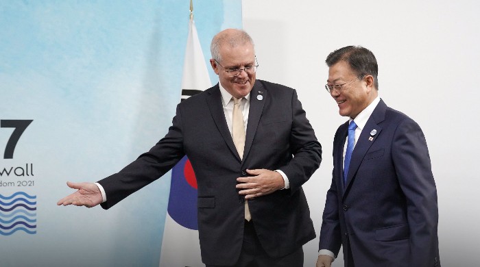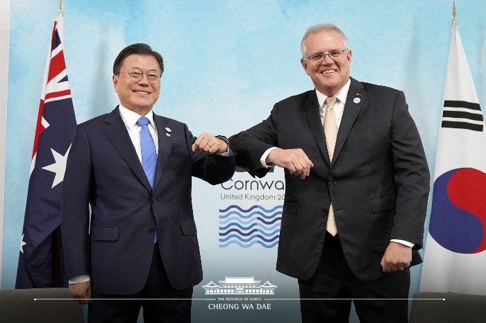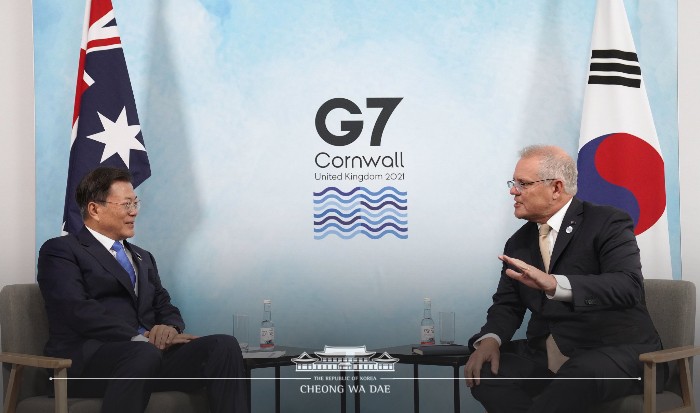 G7 정상회의에 참석한 문재인 대통령은 6월 12일 현지시간 오전 10시 호주 스콧 모리슨 총리와 정상회담을 가졌습니다.