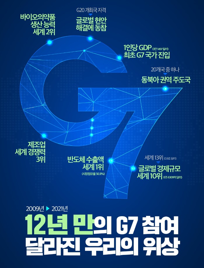 한국의 경제적 국력이 일부 G7 국가보다 높았기 때문입니다. IBRD (국제부흥개발은행) 통계를 보면 한국 GDP는 2020년 기점으로 이미 이탈리아를 넘어섰습니다.