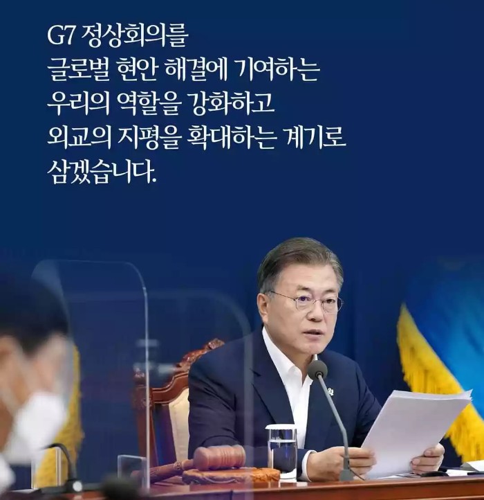 G7 정상회의에 초청받아 모든 일정을 잘 마쳤습니다. 보건, 열린사회, 기후환경, 각 주제별로 지구촌의 책임있는 나라들이 진솔한 의견을 나눴습니다.
