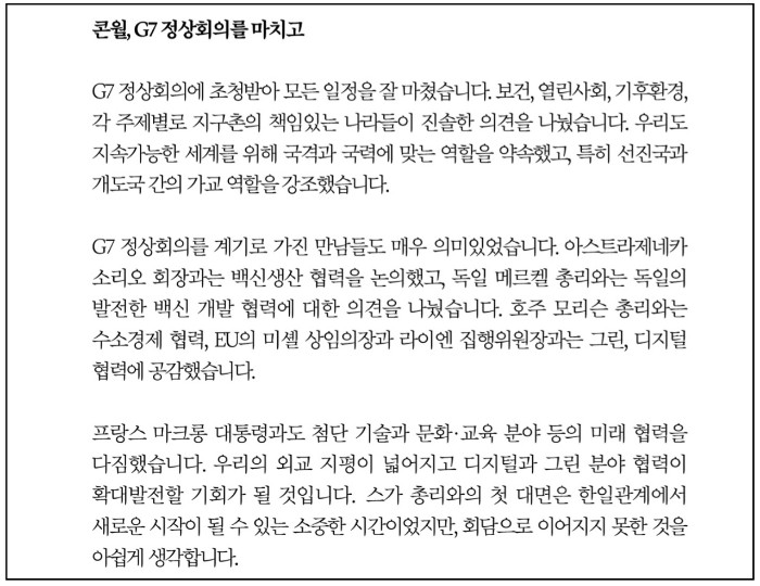 문재인 대통령은 G7 정상회의 모든 일정을 마치고 오스트리아와 스페인 국빈 방문을 위해 영국을 떠나며 SNS에 소감을 남겼습니다.