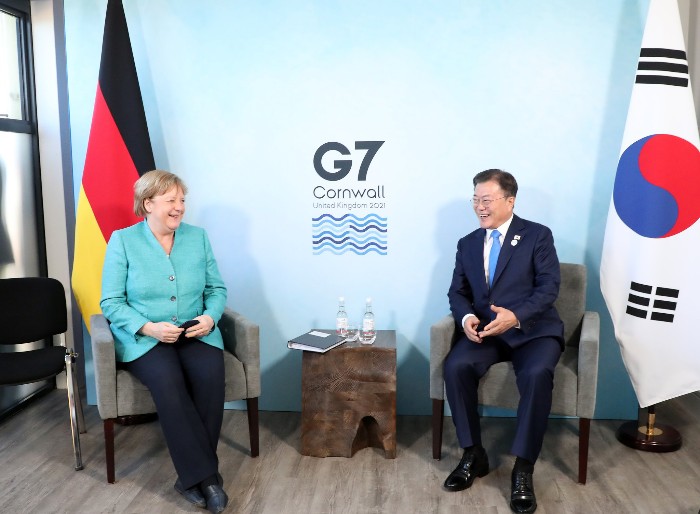 영국에서 열리는 G7 정상회의에 참석 중인 문재인 대통령은 12일 오후 앙겔라 메르켈 독일 총리와 정상회담을 가졌습니다.