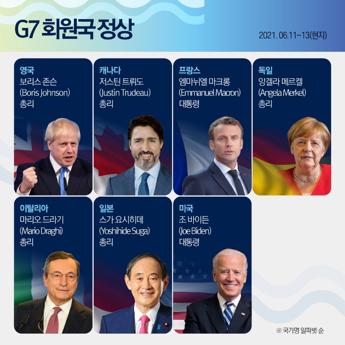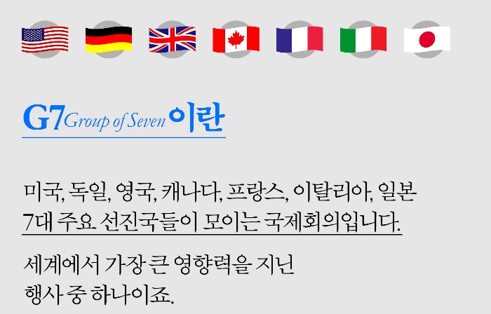 먼저 그동안 G7 정상회의가 어떤 모임이었는지 알아야 합니다. G7 국가란? G7 뜻은 문자 그대로 Group of Seven 입니다. 7개 국가들의 모임입니다. G7 국가는 미국, 영국, 캐나다, 프랑스, 이탈리아, 일본, 독일 입니다.