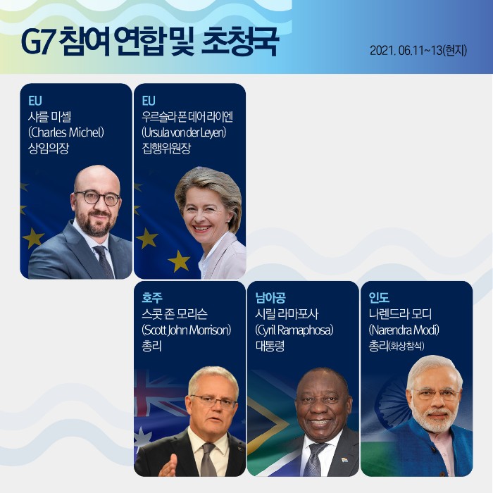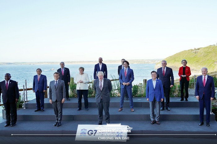 G7 정상회의 1번째 보건 세션에 참석해 영국, 미국, 독일, 프랑스 등 G7 국가정상들과 함께 조속한 백신 공급 확대 및 개도국 백신 지원 및 접종 인프라 지원 방안 등 코로나의 조기 극복 방안을 논의했습니다.