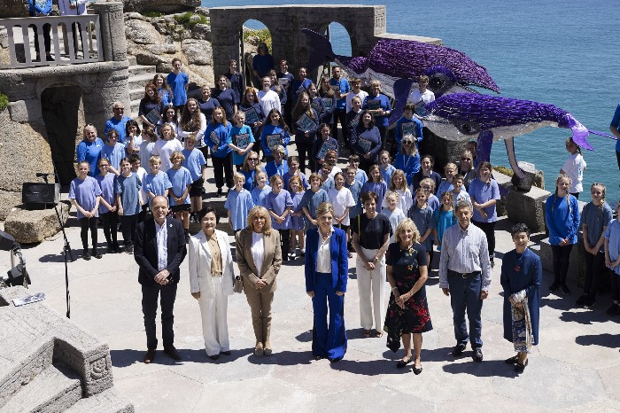 G7 정상회의 배우자 프로그램에서 김정숙 여사는 참여국 정상 배우자들과 콘월지역 학생들이 만든 환경을 주제로 한 공연을 관람하였습니다. 관람 후 공연을 한 학생들, 정상 배우자들과 함께 전 세계적인 기후위기와 대응에 대한 이야기를 나누었습니다.