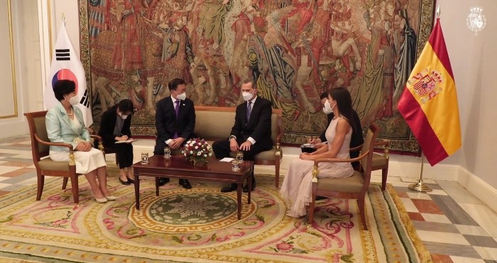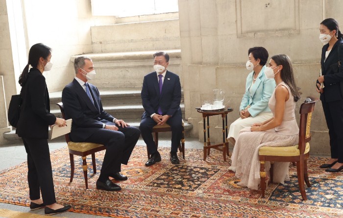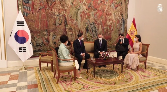 펠리페 6세 국왕은 코로나 초기 방역 분야 협력 지원에 감사를 표한 뒤, 코로나로 힘든 시기인데, 문재인 대통령의 바르셀로나 경제인협회 연례포럼 참석이 긍정적인 메시지가 될 것이다. 경제인 참석 규모가 최대 규모인데 이는 스페인의 한국에 대한 관심을 보여주는 것이라고 답했습니다.