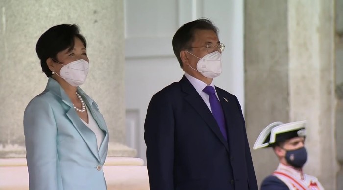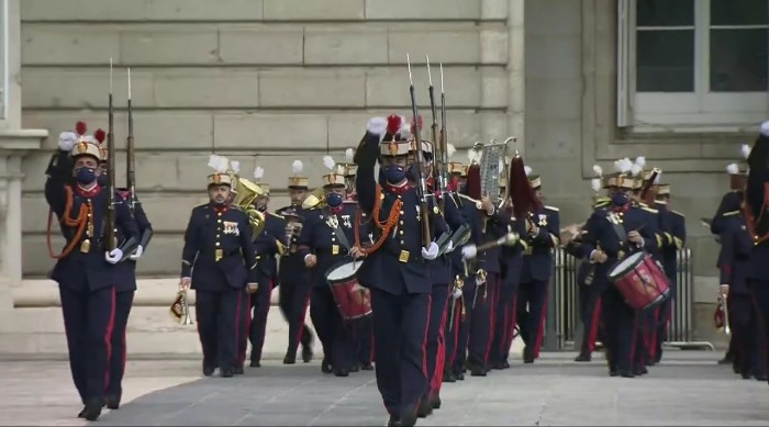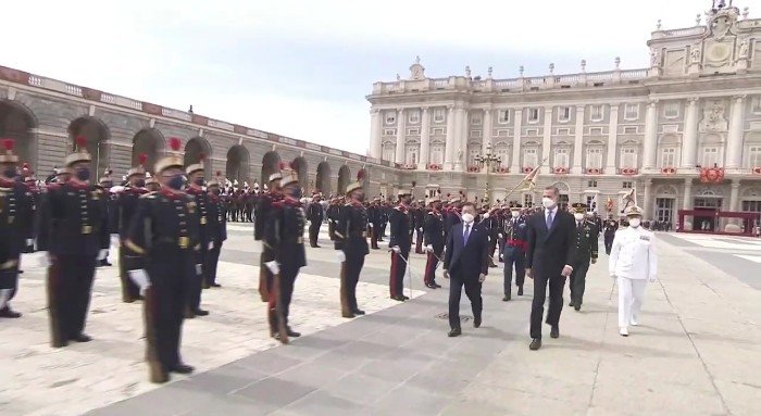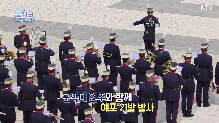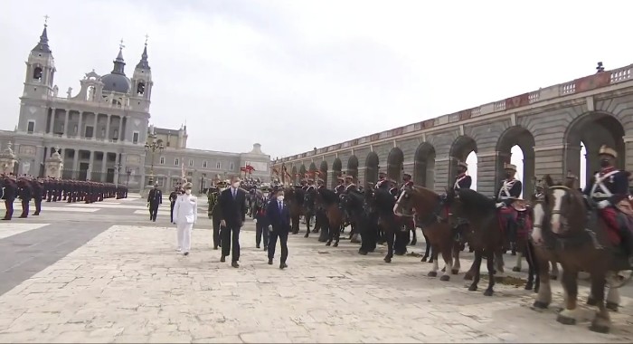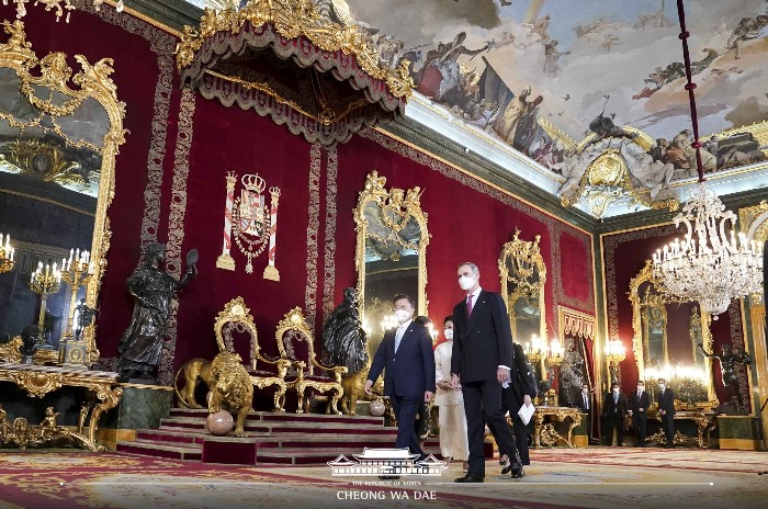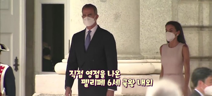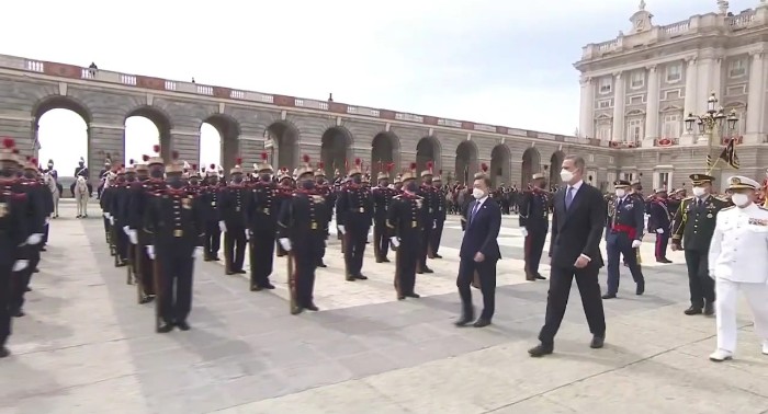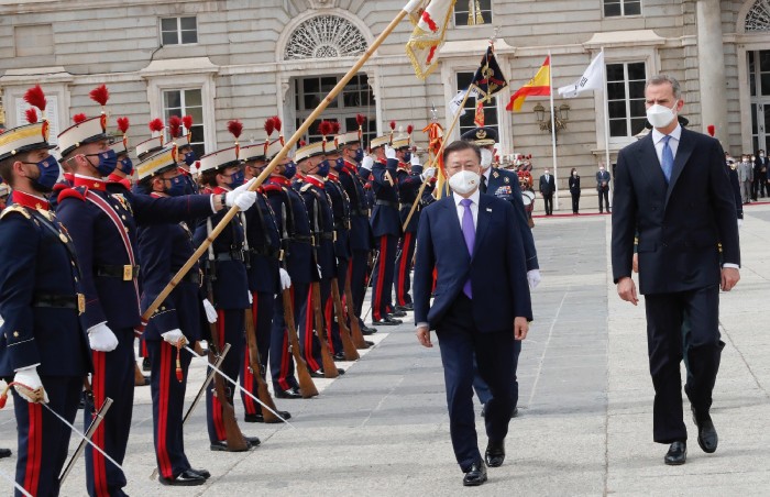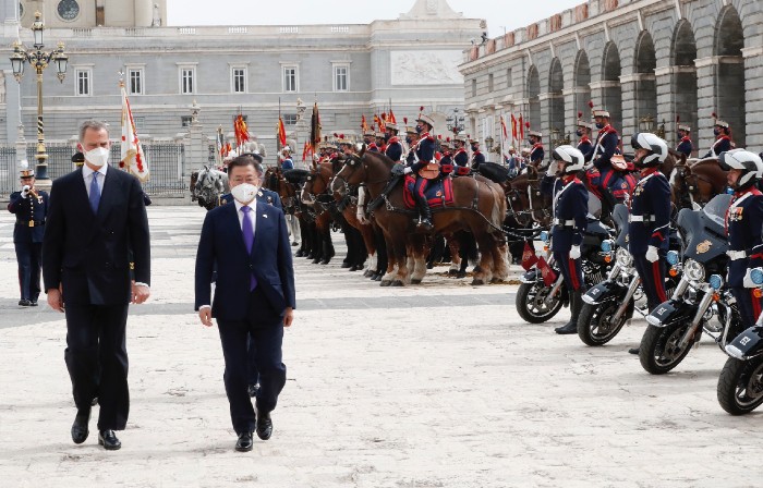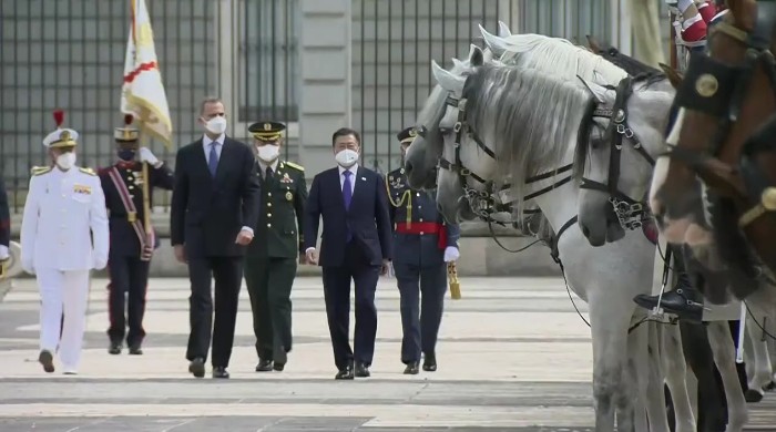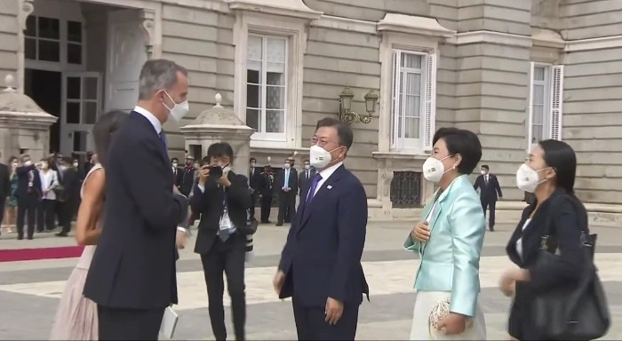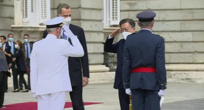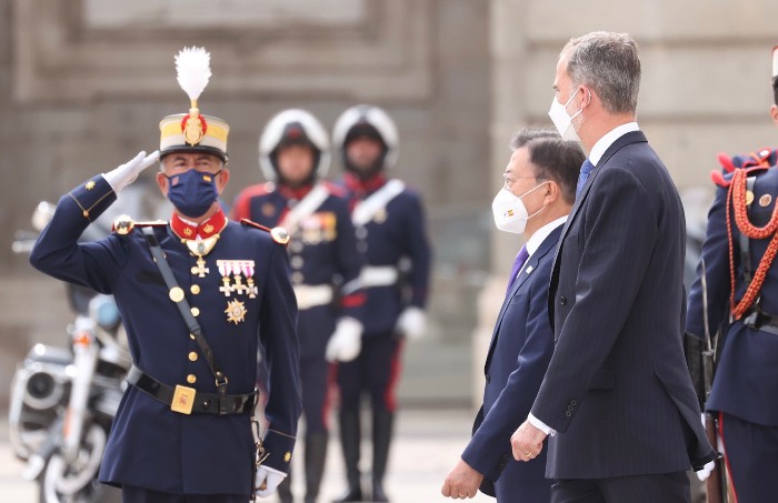 문재인 대통령 부부와 펠리페 6세 부부가 단상에 오른 뒤, 왕궁에는 애국가와 스페인 국가가 연주됐고 연주 중간 공식 예포 21발이 발사됐습니다. 예포 21발은 최고의 경의(Great Honor)를 의미합니다. 스페인 왕실 기마대와 근위대도 화려한 의전으로 문재인 대통령 부부를 환영했습니다.