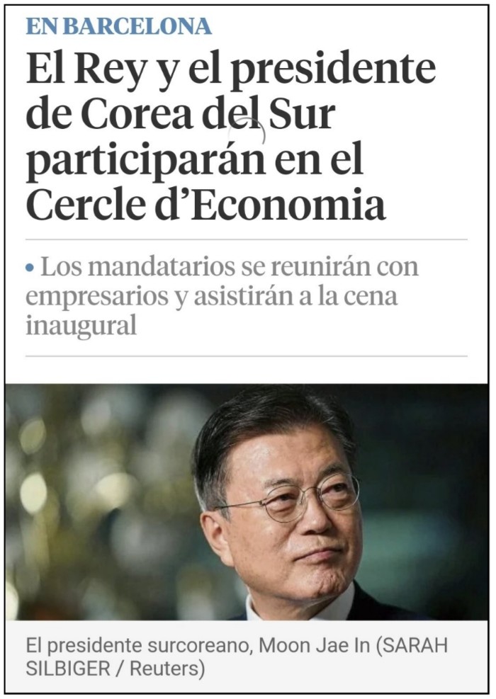 바르셀로나 하비에르 파우스 경제인협회장은 문 대통령과 국왕의 참석에 감사인사를 전하며 대한민국은 세계에서 가장 역동적인 그리고 커다란 자동차, IT, 통신, 영상, 반도체, 화장품 등 아주 모범적인 산업을 가지고 있다. 바르셀로나는 한국인과 모든 세계인들을 환영한다고 환영사를 했습니다.