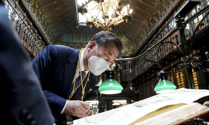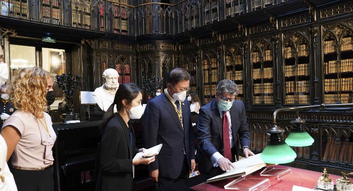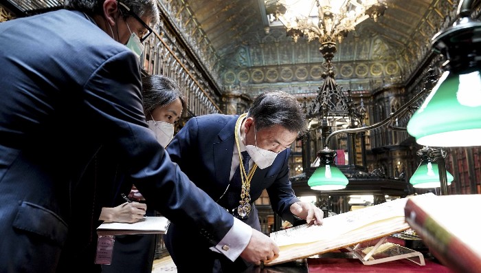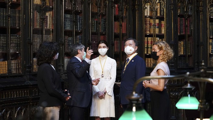 문재인 대통령은 6월 16일 오후 스페인 상하원 합동 연설을 마친 후 상원의장과 하원의장과 함께 스페인 상원도서관을 방문해 이곳에 소장하고 있는 ‘조선왕국전도’에 대한 설명을 들었습니다.