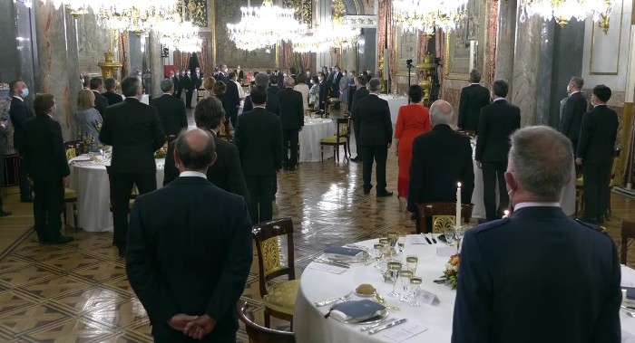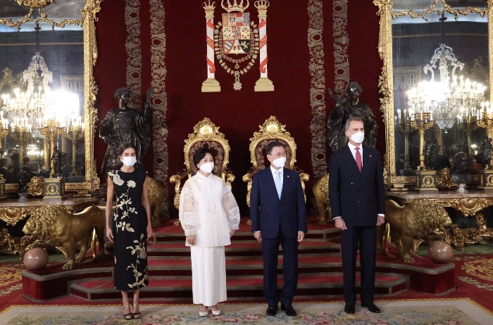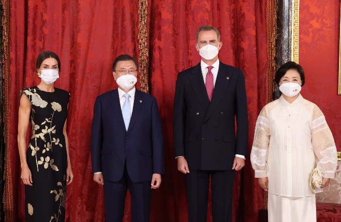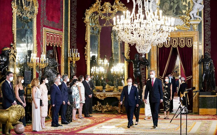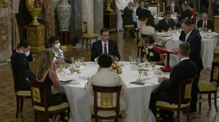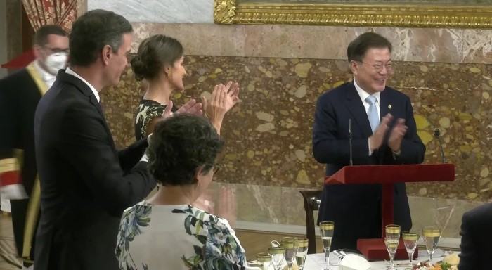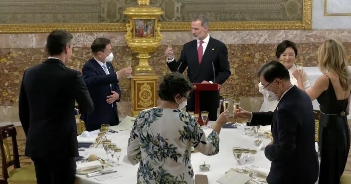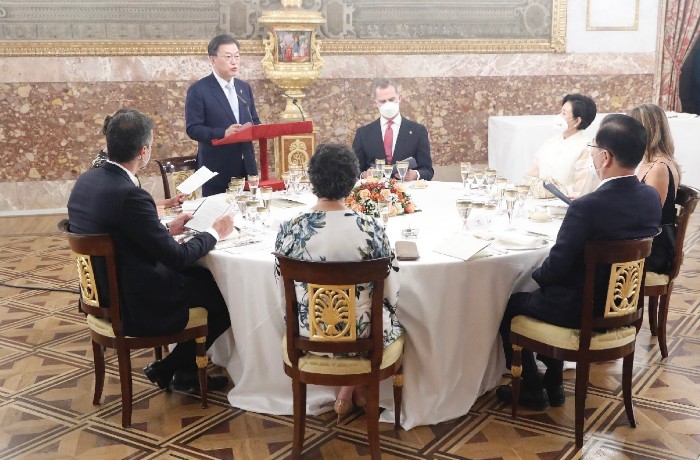 코로나 발생 이후, 첫 국빈으로 초청해 주셔서 무한한 영광이다. 코로나 극복에 탁월한 리더십을 발휘하고 계신 국왕께 경의를 표한다. 2019년 8200여명의 한국인 순례자들이 산티아고 순례길을 걸으며 삶을 돌아보고 마음의 평화와 안식을 얻었다. 양국 관계의 새로운 70년이 시작된 올해 스페인과 한국이 함께 걸어갈 길 또한 서로의 여정에 행운이 될 것이라고 말했습니다. 답사를 마치고 대통령은 양국간의 영원한 우정을 위해 건배를 제의했습니다.