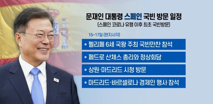 문재인 대통령은 6월 15일 ~ 17일까지는 스페인을 국빈 방문합니다. 한국 대통령으로서는 14년만에 이뤄지는 국빈 방문입니다. 스페인으로서는 코로나 이후 최초 외국 정상 국빈 방문을 의미합니다.