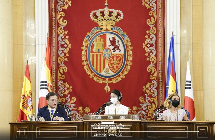 문재인 대통령은 대한민국 대통령으로서는 최초로 스페인 마드리드의 상원의사당을 방문하여, 상하원 의원 앞에서 합동연설을 했습니다.