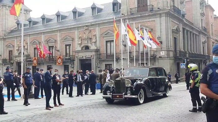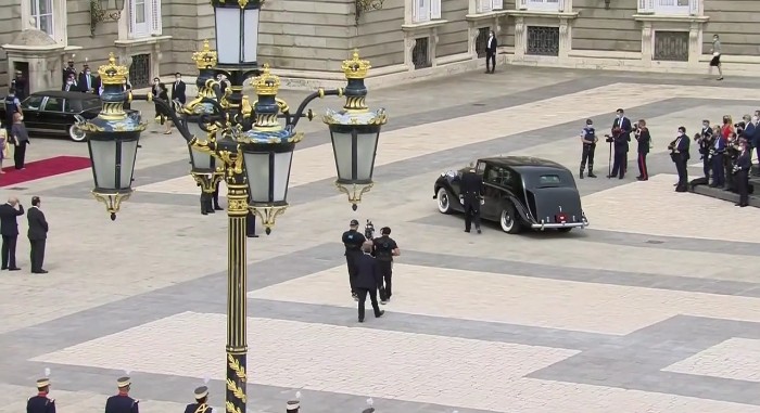 문재인 대통령 부부가 탄 국왕 전용차 롤스로이스 팬텀 Ⅳ 차량은 왕궁 팔라시오 레알로 들어와 도열한 300여명의 군악대와 의장대를 통과해 멈췄고, 차 앞까지 마중을 나온 펠리페 6세 국왕 부부는 반갑게 인사를 건넸습니다.