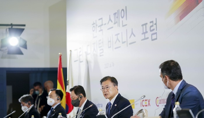 문재인 대통령은 6월 16일 오전 마드리드 스페인 상공회의소에서 열린 한국-스페인 그린·디지털 비즈니스 포럼에 참석했습니다.