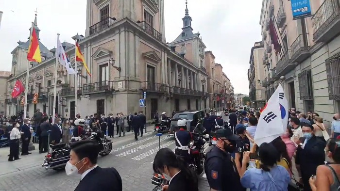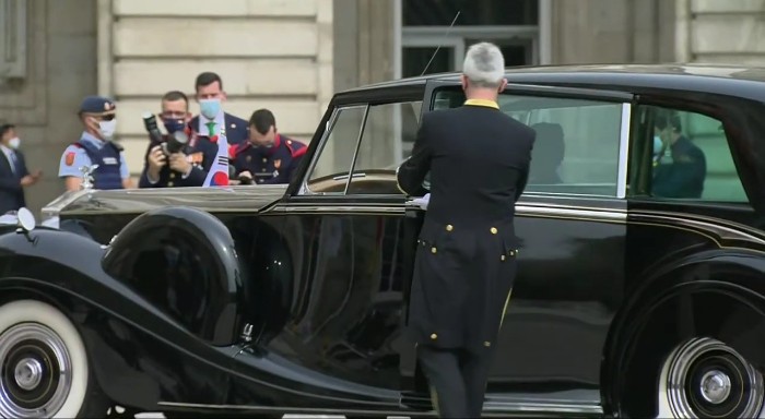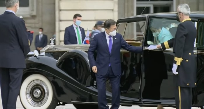문재인 대통령은 스페인 국왕 전용 차량인 롤스로이스 팬텀Ⅳ를 타고 등장했습니다. 문재인 대통령 부부를 극진히 모시는 예우에 감격적입니다.