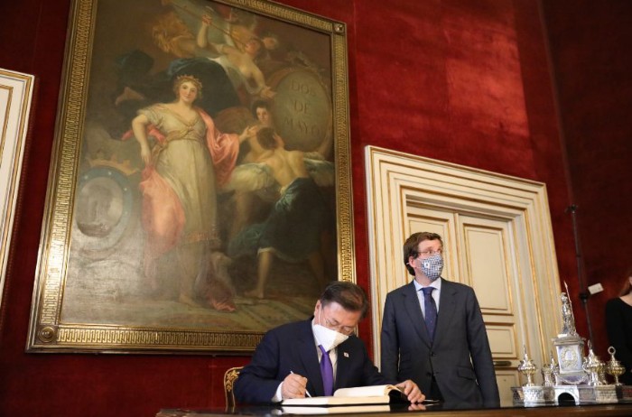 문재인 대통령은 6월 15일 오후 마드리드 시청을 방문하여 알메이다 시장을 접견했습니다. 도한 시청에 도착한 직후 시청 앞에 모인 스페인 시민과 한국교민들을 보고 알메이다 시장과 함께 다가가 인사를 나눴고, 시청 고야홀에서 시청 방명록에 글을 남겼습니다.
