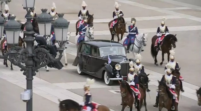 롤스로이스 팬텀 Ⅳ는 2차 세계대전 후인 1950년 ~ 1956년 사이 딱 18대만 생산된 차로 현재 영국 왕실과 스페인 왕실 등에서 보유 중입니다. 롤스로이스 팬텀 Ⅳ는 왕실과 국가 원수의 중요 행사에만 사용합니다. 현재 스페인은 3대의 롤스로이스 팬텀 Ⅳ 차량을 운용 중이며, 오늘 등장한 차량은 국왕 전용 차량으로 번호판에는 숫자 대신 왕관이 그려져 있습니다.