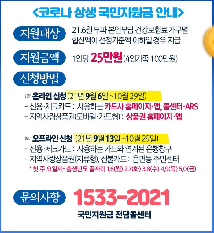 지역사랑상품권 모바일형, 일부 카드형으로 국민지원금을 받으려는 신청자는 9월 6일부터 지자체 지역사랑상품권 앱 또는 홈페이지에서 온라인으로 신청할 수 있습니다
