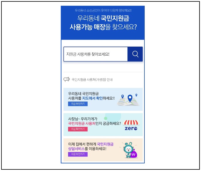 또한 국민지원금 사용처는 지역사랑상품권 앱, 자치단체 홈페이지 또는 국민지원금 사용처 홈페이지(https://국민지원금사용처.kr)에서 확인할 수 있습니다.