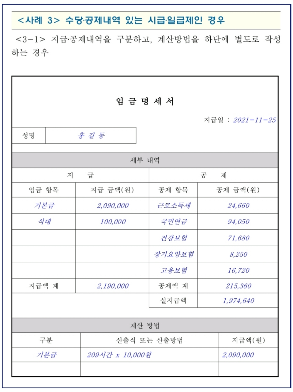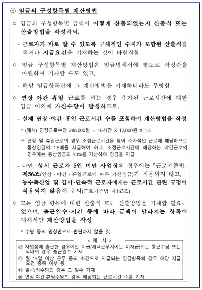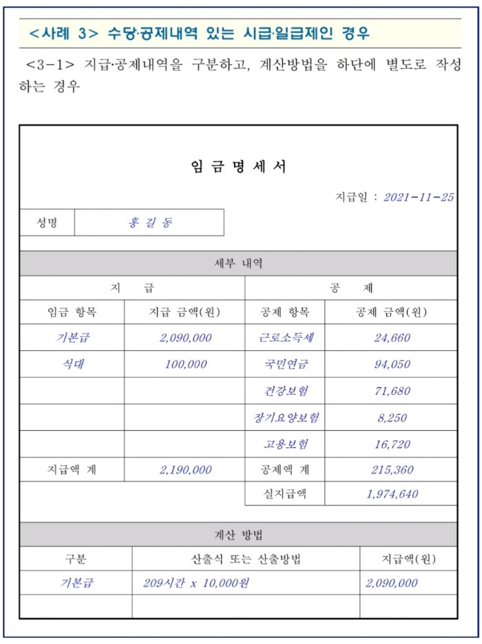 - 임금 구성항목별 계산방법은 임금명세서에 별도로 작성란을 마련하여 기재할 수도 있고, 해당 임금항목란에서 그 계산방법을 기재하더라도 무방하다.
