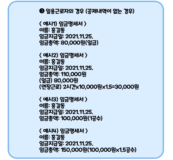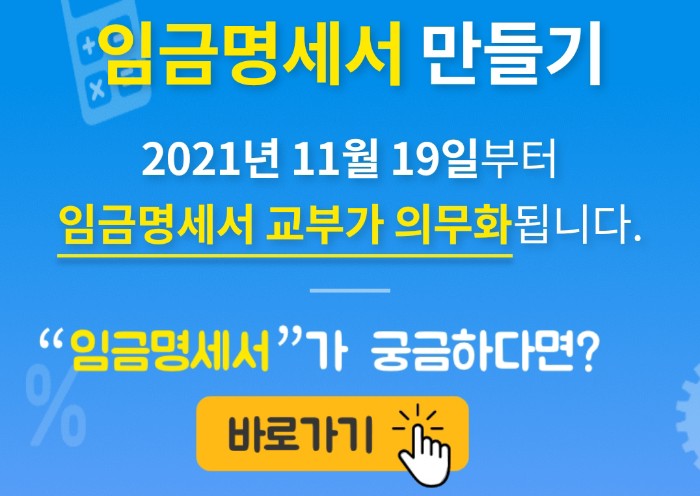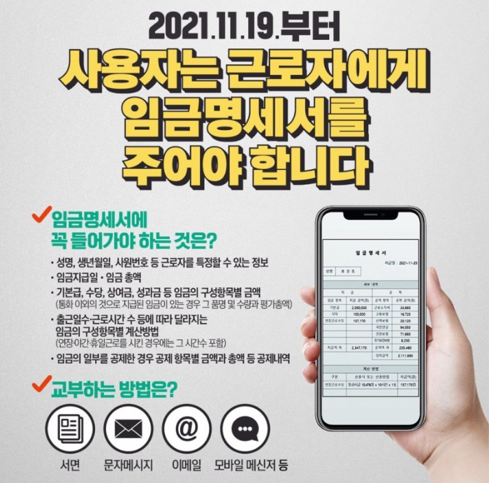 2021년 11월 19일부터 사용자가 근로자에게 임금을 줄 때, 임금의 구성항목 및 계산방법, 공제내역 등을 적은 임금명세서를 함께 주어야 합니다.