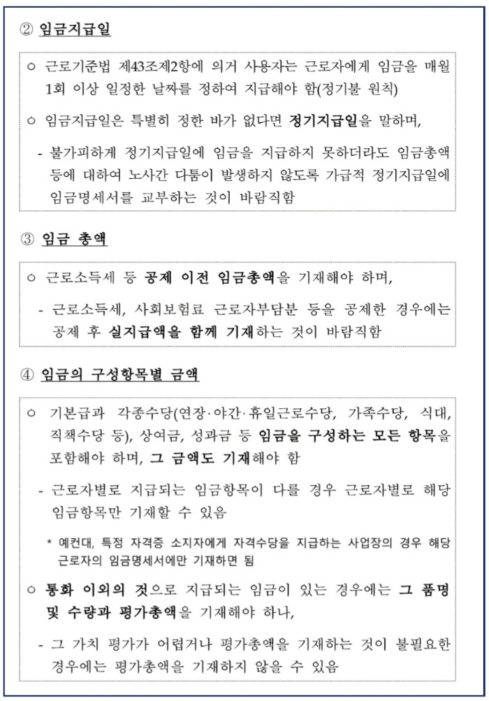 ② 임금명세서에는 임금의 구성항목, 계산방법, 공제내역 등 대통령령으로 정하는 사항을 기재해야 합니다.