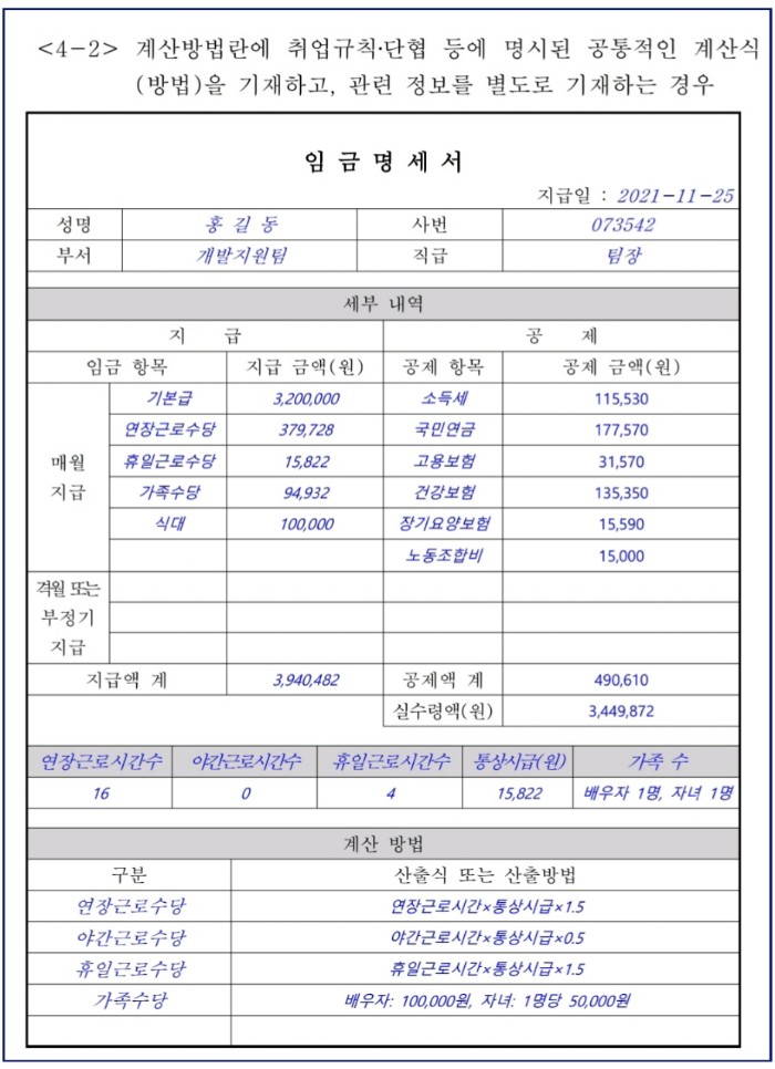 - 임금명세서 일괄 작성 등 편의를 위해 취업규칙이나 근로계약서 등에 기재된 기본적인 계산방법을 공통적으로 기재하고, 계산에 필요한 정보를 별도로 기재하는 것도 가능하다.