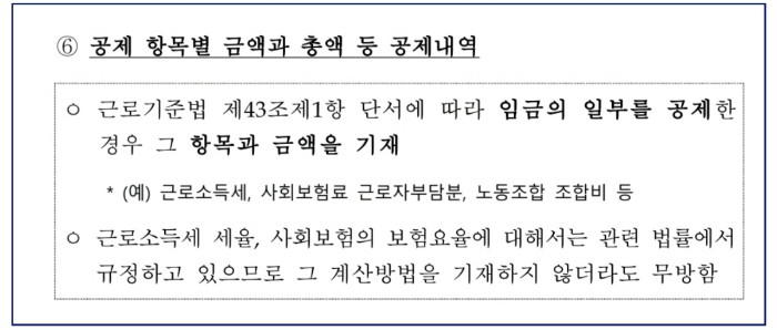 - 공제 항목과 항목별 금액만 기재하면 되며, 근로소득세 세율, 사회보험의 보험요율에 대해서는 관련 법률에서 규정하고 있으므로 그 계산방법을 기재하지 않더라도 무방하다.