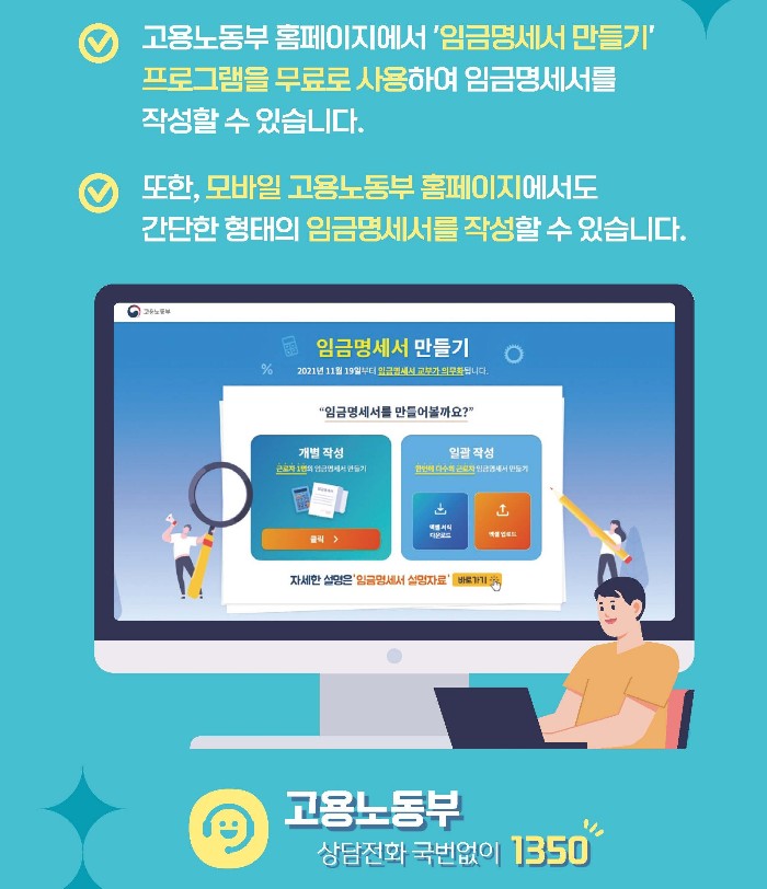 임금명세서 교부에 대한 사용자의 인사노무관리의 부담을 완화하기 위해 손쉽게 전자적 형태의 임금명세서를 작성할 수 있도록, 고용노동부 홈페이지를 통해 ‘임금명세서 작성 프로그램’을 무료로 보급하고 있습니다.