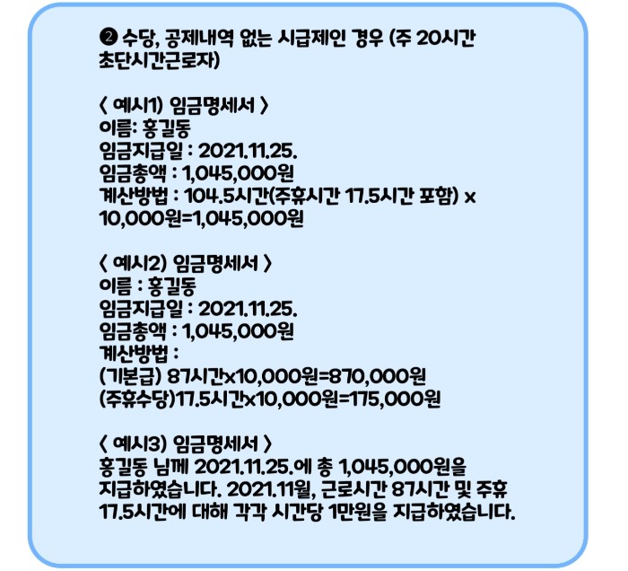 - 연장, 야간, 휴일 근로를 하는 경우 추가된 근로시간에 대한 임금 이외에 가산수당이 발생하므로 실제 연장, 야간, 휴일 근로시간 수를 포함하여 계산방법을 작성한다.