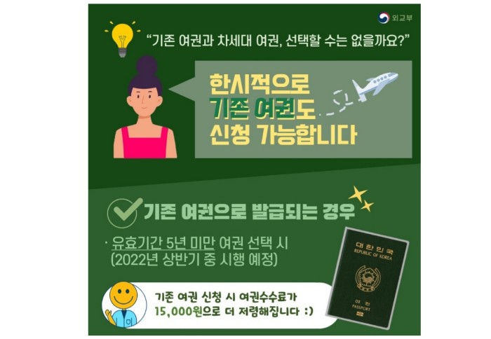 2022년 상반기 내 한시적으로 저렴한 비용(15000원)으로 기존 여권(녹색)을 5년미만 유효기간으로 발급 받을 수 있습니다. 이와 관련한 상세 사항은 내년에 공지할 예정입니다.
