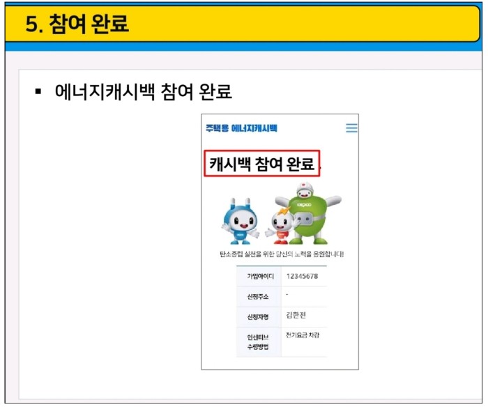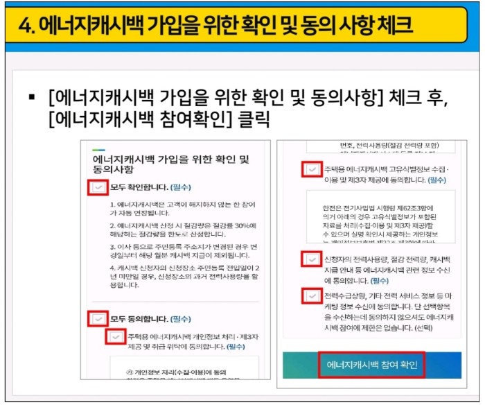 - [에너지캐시백 가입을 위한 확인 및 동의사항] 체크 후, [에너지캐시백 참여확인] 클릭