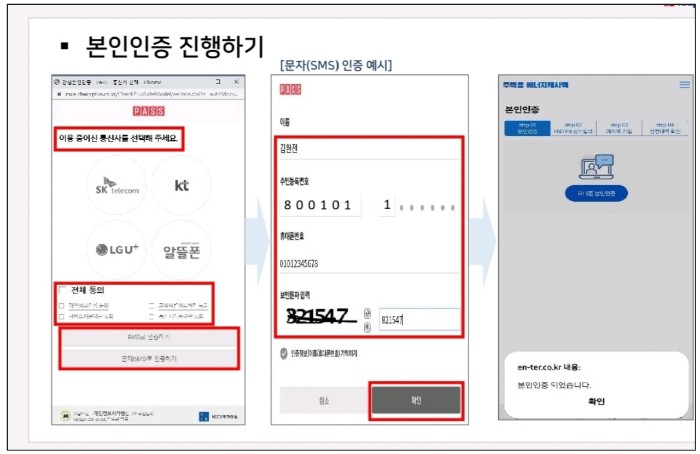- 안내 및 동의사항 확인 및 고객정보 입력 후 인증 처리
