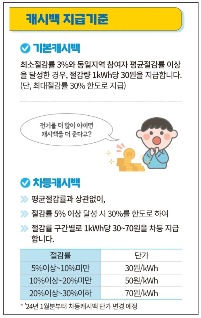 주택용 에너지캐시백은 과거 2년 동월 평균 대비 절감률을 3%이상 줄이고 동일 검침일, 동일지역 참여자 평균절감률 이상 달성할 경우 1kWh당 30원을 지급합니다.