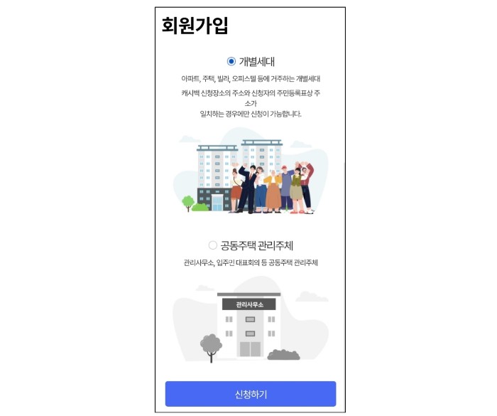 - 아파트, 주택, 빌라, 오피스텔 등에 거주하는 개별세대 캐시백 신청장소의 주소와 신청자의 주민등록표상 주소가 일치하는 경우에만 신청이 가능합니다.