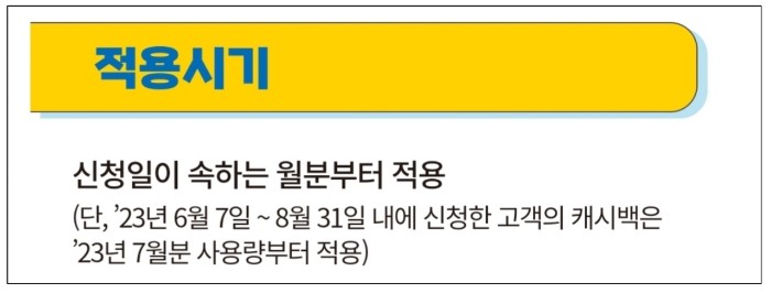 신청일이 속하는 월분부터 적용합니다. 단 2023년 6월 7일~8월 31일 내에 신청한 고객의 에너지캐시백은 2023년 7월분 사용량부터 적용됩니다.