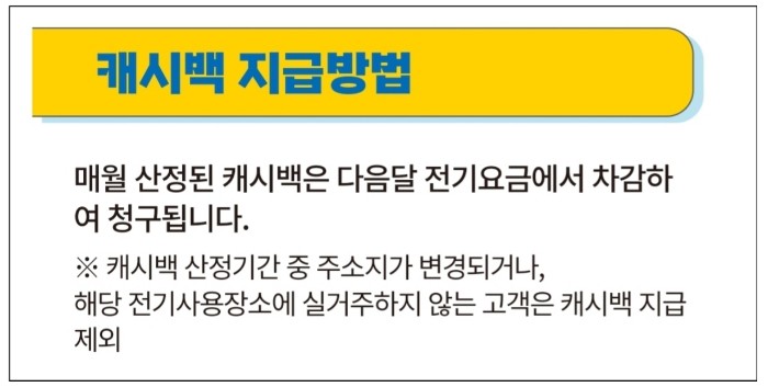- 매월 산정된 에너지캐시백은 다음달 전기요금에서 차감하여 청구됩니다.