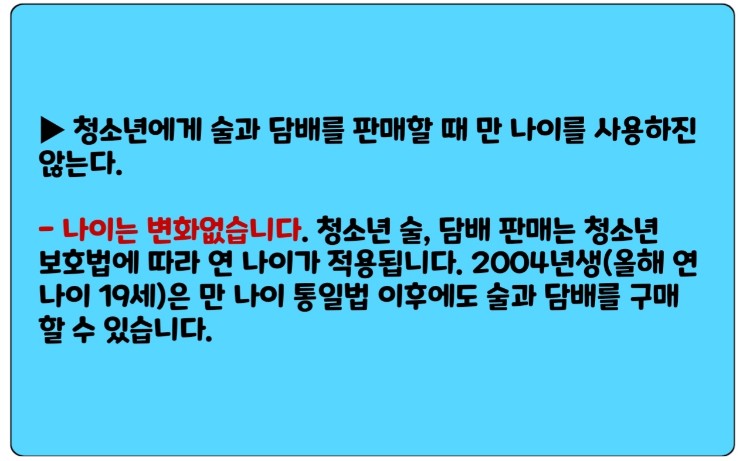 - 변화없습니다. 청소년 술, 담배 판매는 청소년 보호법에 따라 연 나이가 적용됩니다. 2004년생(올해 연 나이 19세)은 만 나이 통일법 이후에도 술과 담배를 구매 할 수 있습니다.
