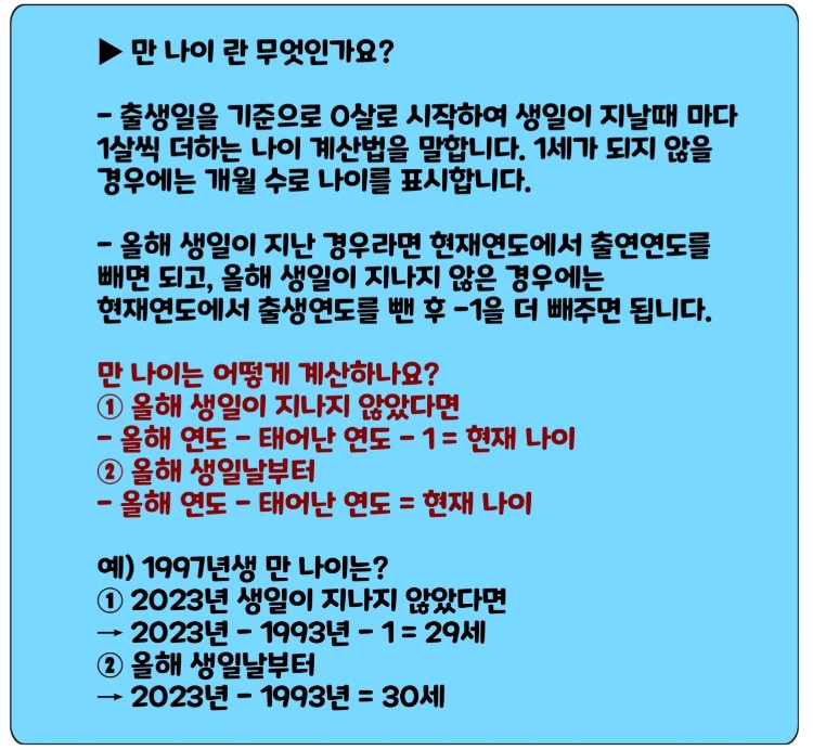 - 올해 생일이 지난 경우라면 현재연도에서 출연연도를 빼면 되고, 올해 생일이 지나지 않은 경우에는 현재연도에서 출생연도를 뺀 후 -1을 더 빼주면 됩니다.