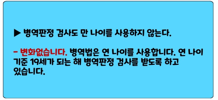 - 변화 없습니다. 병역법은 연 나이를 사용합니다. 연 나이 기준 19세가 되는 해 병역판정 검사를 받도록 하고 있습니다.