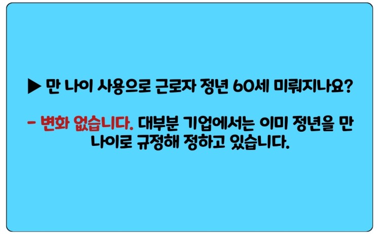 - 변화 없습니다. 대부분 기업에서는 이미 정년을 만 나이로 규정해 정하고 있습니다.