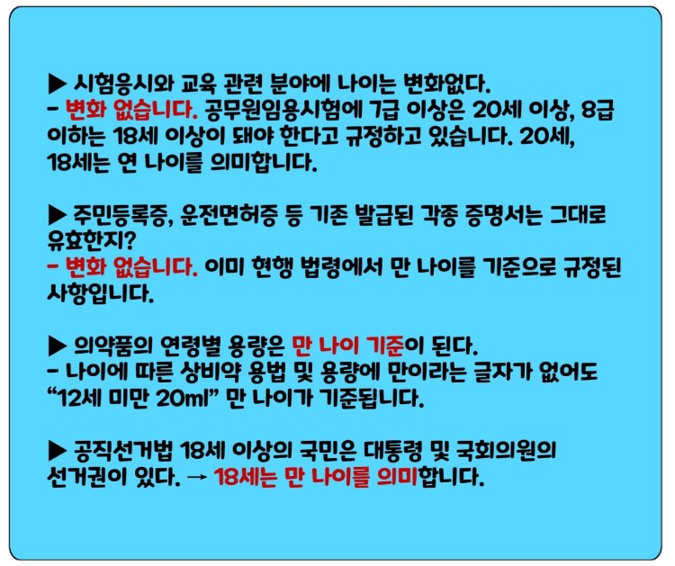 - 변화 없습니다. 이미 현행 법령에서 만 나이를 기준으로 규정된 사항입니다.