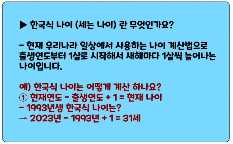 ① 현재연도 - 출생연도 + 1 = 현재 나이