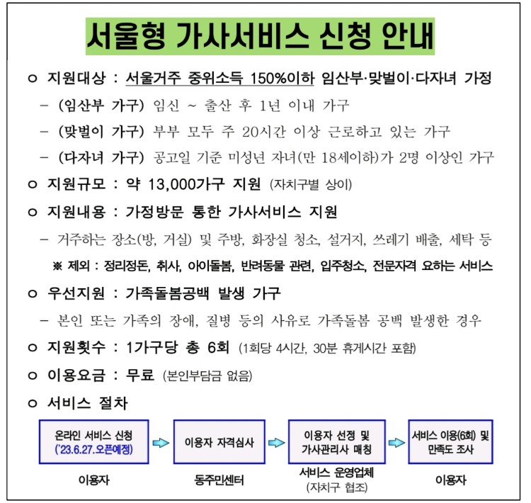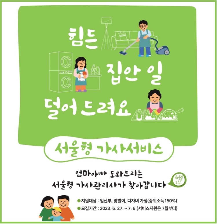 서울형 가사서비스 신청자격은 서울에 거주하는 중위소득 150%이하 임산부 가구, 맞벌이 가구, 다자녀 가정이 대상자에 해당되며 신청 통해 자격확인 후 선정되면 서울형 가사서비스를 이용할 수 있습니다.