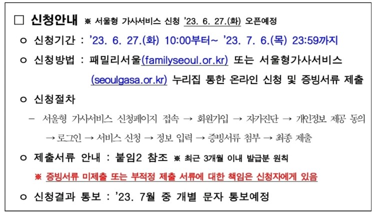 - 패밀리서울(familyseoul.or.kr) 또는 서울형가사서비스(seoulgasa.or.kr) 통한 온라인 신청 및 증빙서류 제출